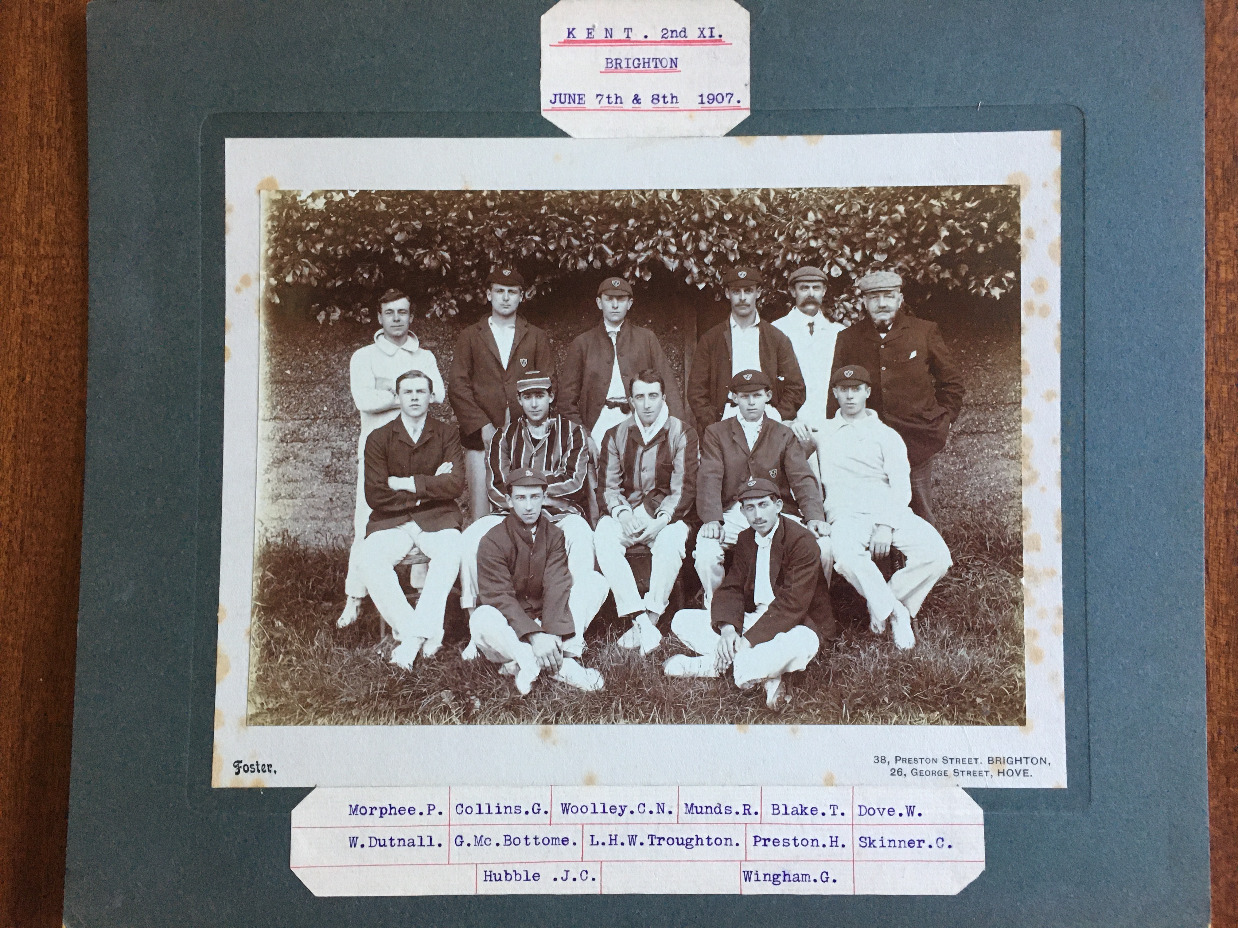 My favourite is headed “Kent Second XI, Brighton, June 7th and 8th 1907”. Not only are all the players identified, but the match is easily researched on Cricket Archive, which shows that not only did Kent win by an innings and 125 runs, but the photographer got the date wrong – it was actually played on 17th and 18th June that year.