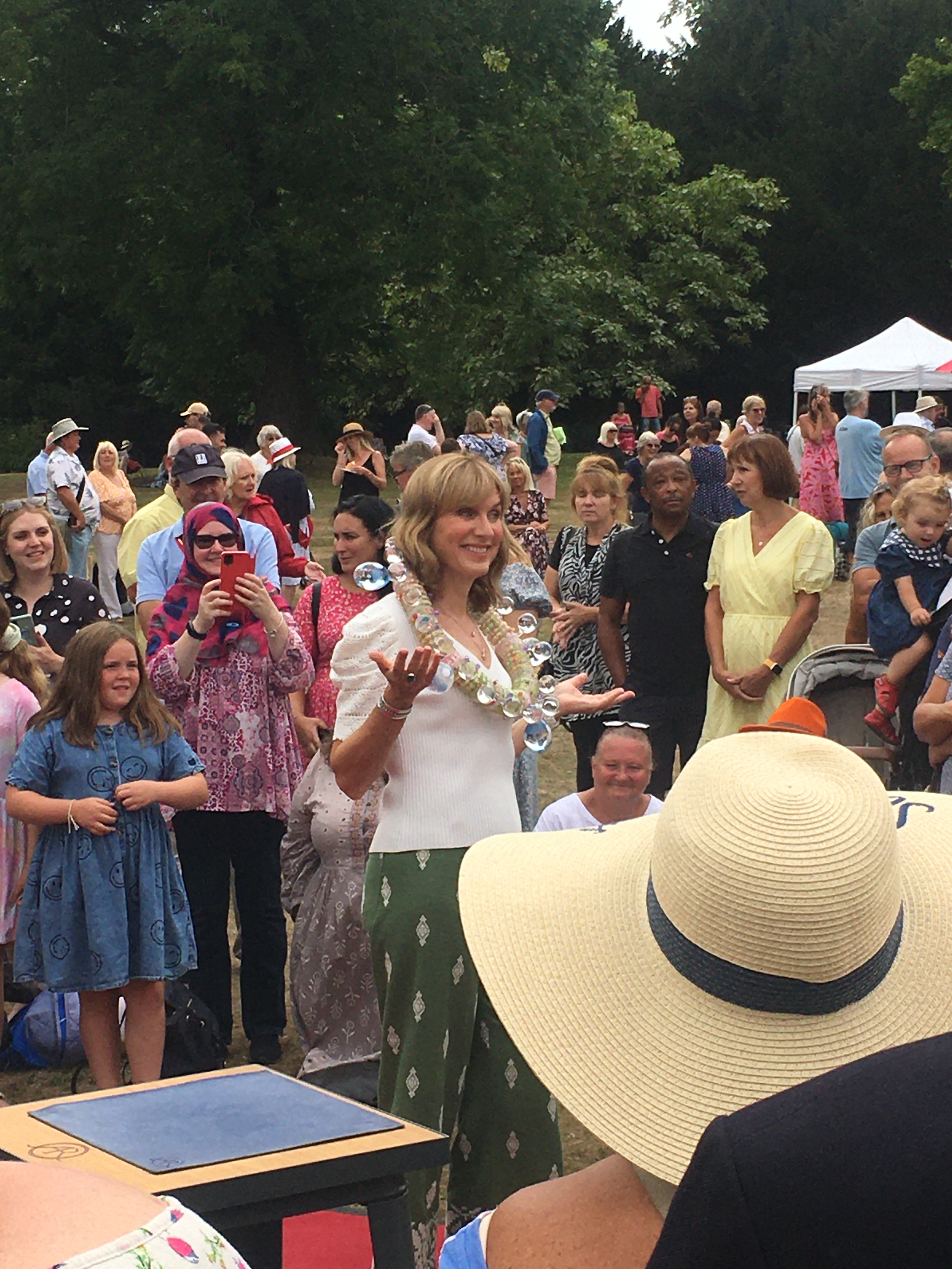 In mid-June, Celebrity Antiques Road Trip, a show that involves travelling round the country picking up antiques and then selling them at auction for what is so rarely a profit, was touring the antiques shops of Whitstable, Margate and the north coast of the county, and wanted to come to the St Lawrence ground to see some cricketing antiques (not just Darren Stevens), one of the celebrities, Bobby Seagull, being a huge cricket fan. Kent were playing Gloucestershire that day (we eventually won by 8 wickets), so filming at the ground was limited, but we managed instead to get out to Harbledown CC (to whom many thanks for their hospitality) to talk about early cricket in the county and film a few attempts to play cricket on that sweltering afternoon. The fact that one of the cameramen, a Scot, did not even know how many players make up a cricket XI meant that getting the right angles for exciting shots took longer than we expected. We then decamped back to the Spitfire Ground where we showed them a few items from our collections, including Alfred Mynn’s bat from 1838 and a trophy or two. The show is to be aired this winter, but we haven’t got a date yet.