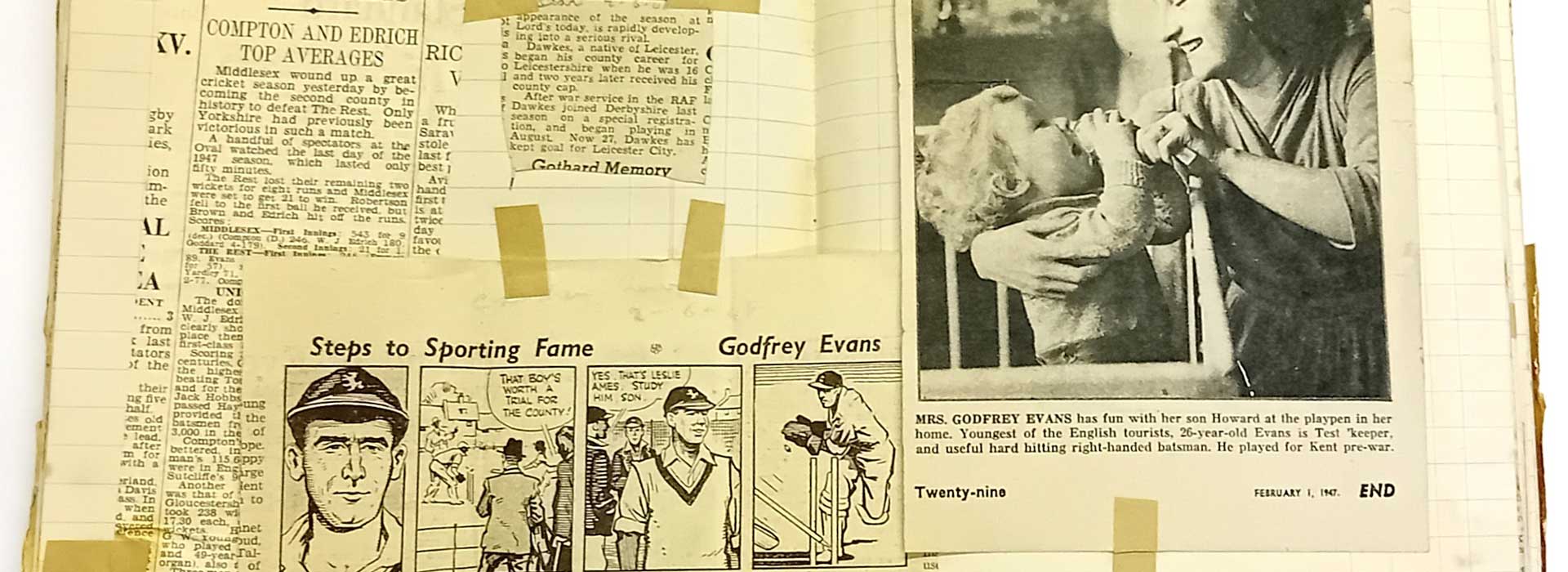 The collection at Canterbury includes many items that tell Godfrey’s story. These include a presentation cigar box from the New South Wales Cricket Association to family photograph albums with images from his military service, cricketing tours of Australia and family snapshots. In addition, we have several scrapbooks of newspaper cuttings from his career which were compiled by his admirers.