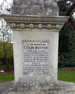 Each year, on November 8th, a ceremony is held at the Memorial, where wreaths are laid by the President and captain of the county club, as well as by representatives of the local regiment. The inscription is simple: To the memory of Colin Blythe of the Kent Eleven, who volunteered for active service upon the outbreak of hostilities in the Great War of 1914-18, and was killed at Ypres on the 8th Nov 1917, aged 38. He was unsurpassed among the famous bowlers of the period and beloved by his fellow cricketers.